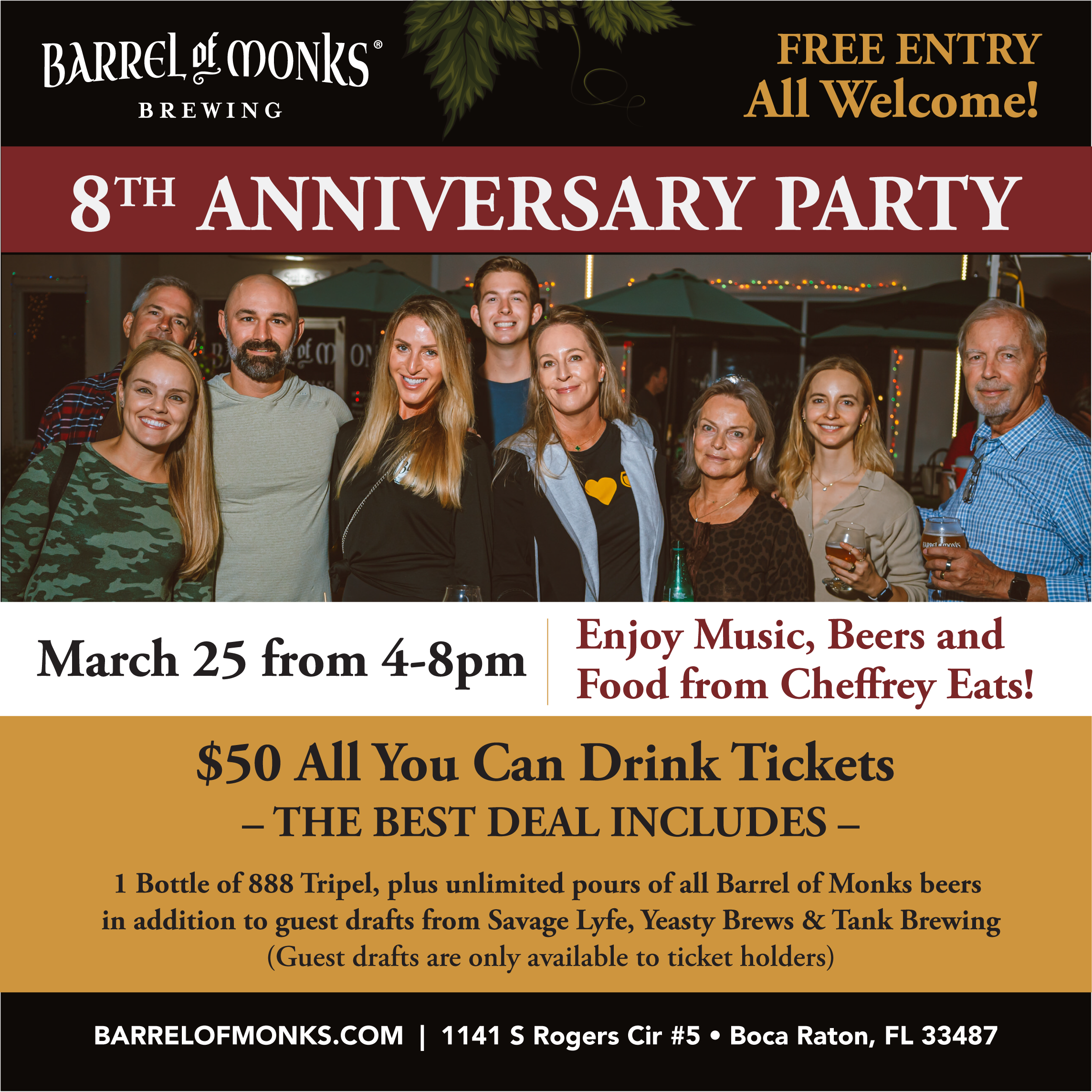 The event is free to attend, but you can purchase an AYCD (All You Can Drink) ticket for $50 and get unlimited pours of all Barrel of Monks beers in addition to guest drafts from Savage Lyfe, Yeasty Brews Artisanal Beers & Tank Brewing.
