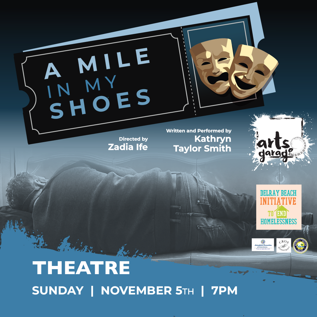 Organizations will be present at the beginning and through the end of the show with vendor tables setup in the theater for guests attending. This performance is followed by a brief presentation by Ariana Cianco, Service Population Advocate of the Delray Beach Police Department and Ezra Krieg, Chairman of the Delray Beach Initiative to End Homelessness with a 10 minute Q & A involving Ariana, Ezra and Kathryn Taylor Smith.