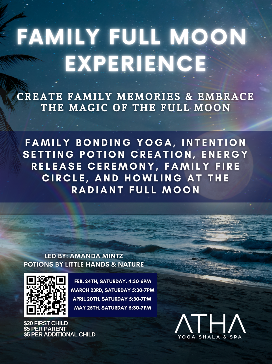 Join us at ATHA in Delray Beach, FL, for a monthly reoccurring family yoga event called the “Family Full Moon Yoga.” This event, designed for families, is an engaging yoga gathering coinciding with the full moon, held in the serene ATHA garden. Key highlights of our Family Full Moon Experience: When:This event takes place on the Saturday closest to the full moon date, ensuring an ethereal atmosphere. Pre-registration is required: