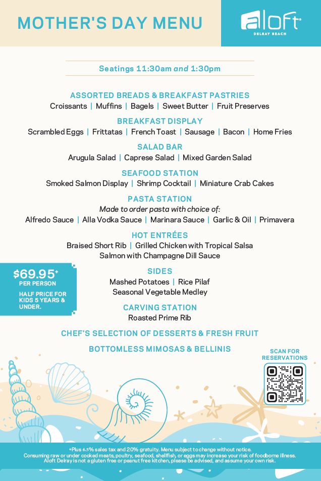 A Grand Mother’s Day Brunch in the Aloft Delray Beach Ballroom with 2 seating times, 11:30AM and 1:30PM. $69.95 plus tax and 20% gratuity, which includes bottomless Mimosas and Bellini’s.