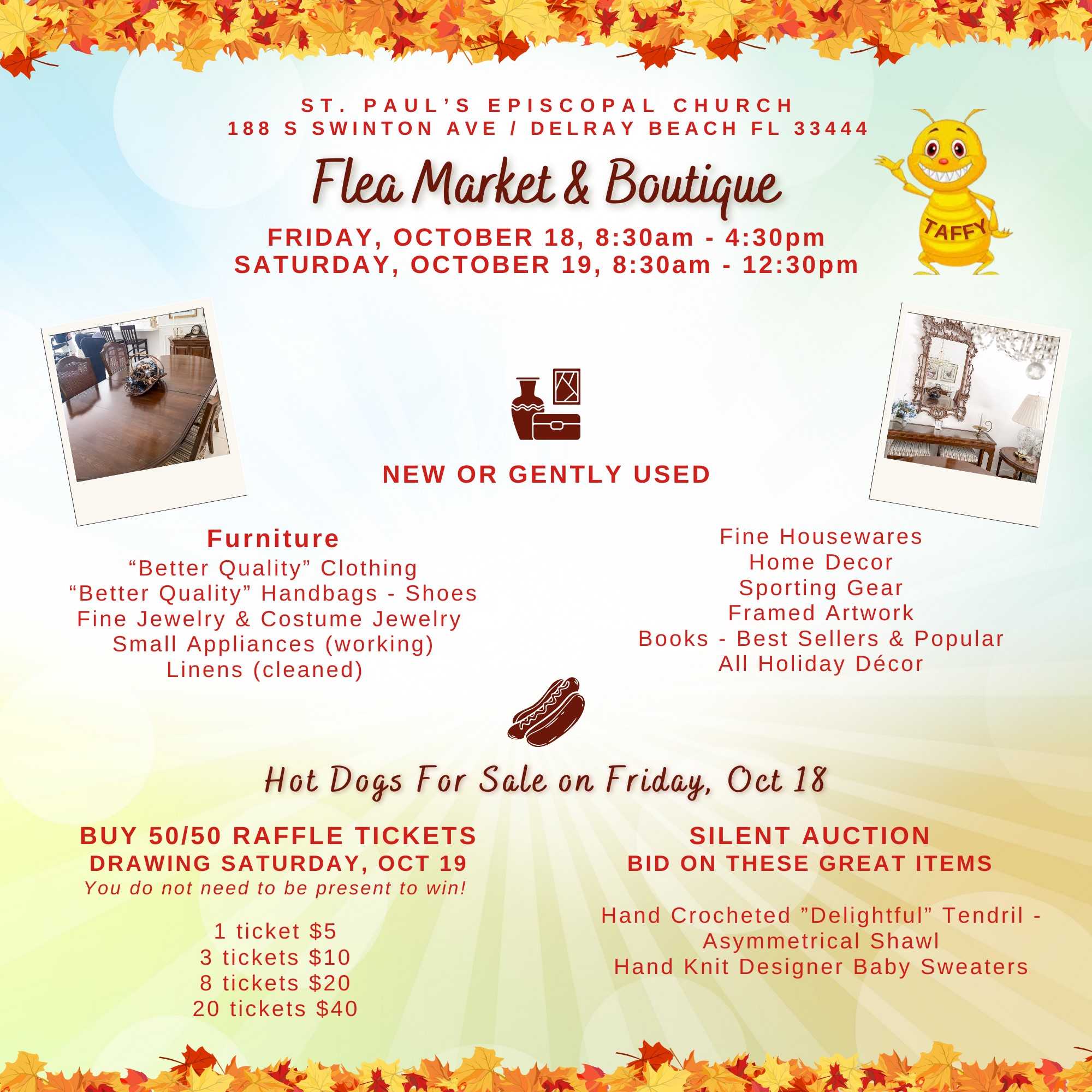 All New or Gently Used Furniture, Small Appliances, “Better” Clothing, Shoes and Handbags, Costume and Fine Jewelry, Framed Artwork, Linens, Holiday Decor and Fine Housewares