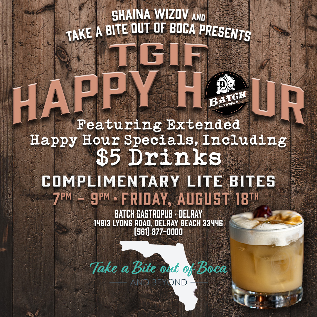 Raise a glass to the weekend! Come out for a fun Friday night out at Batch Gastropub at the Delray Marketplace on August 18th. $5 drink specials and light bites will be provided. RSVP required.