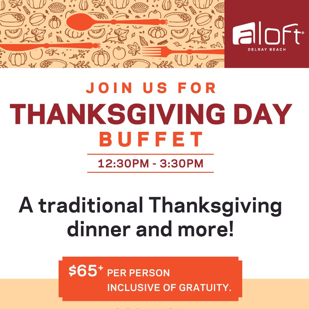 We welcome you into our home for a Thanksgiving Day dining experience at Aloft Delray Beach. Gather family and friends and enjoy a cornucopia of delicious delights expertly prepared by our talented chefs. We bring happiness to hungry bellies with this year’s menu that includes Salmon, Honey Glazed Ham, Roasted Turkey Carving Station, and so many new, Thanksgiving favorites. Price is inclusive of Gratuity. Applicable taxes and fees applied at time of purchase.