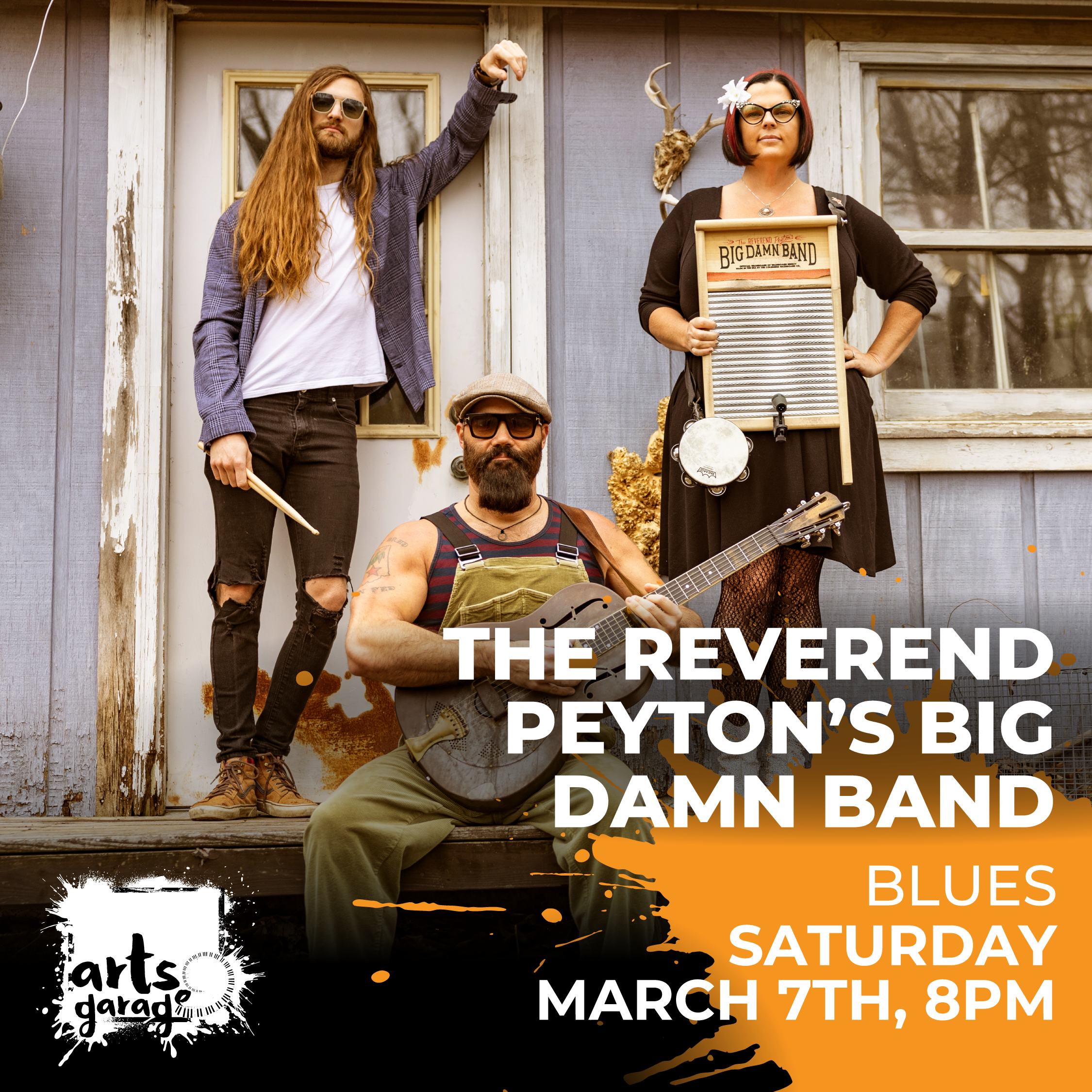 Often called, “the greatest front-porch blues band in the world” the Big Damn Band is led by Reverend Peyton, who is considered to be the premier finger pickers playing today. Rev has earned a reputation as both a singularly compelling performer and a persuasive evangelist for the rootsy, country blues styles that captured his imagination early in life and inspired him and his band to make pilgrimages to Clarksdale, Mississippi to study under such blues masters as T-Model Ford, Robert Belfour and David “Honeyboy” Edwards. Accompanied by Rev’s wife, the washboard virtuoso, Washboard Breezy Peyton, and kept on time by the deep rhythms of Jacob “The Snakob” Powell, Reverend Peyton’s Big Damn Band will leave you clapping, stomping, and singing along every handmade show across the world. Their latest record Dance Songs For Hard Times went #1 on the Billboard, iTunes and Sirius XM Blues Charts and was produced by Grammy winner Vance Powell (Jack White, Chris Stapleton). The record is critically acclaimed by Rolling Stone, Relix, Popmatters, Guitar World, American Songwriter, No Depression, Glide, Wide Open Country, Paste, American Blues Scene and many more.