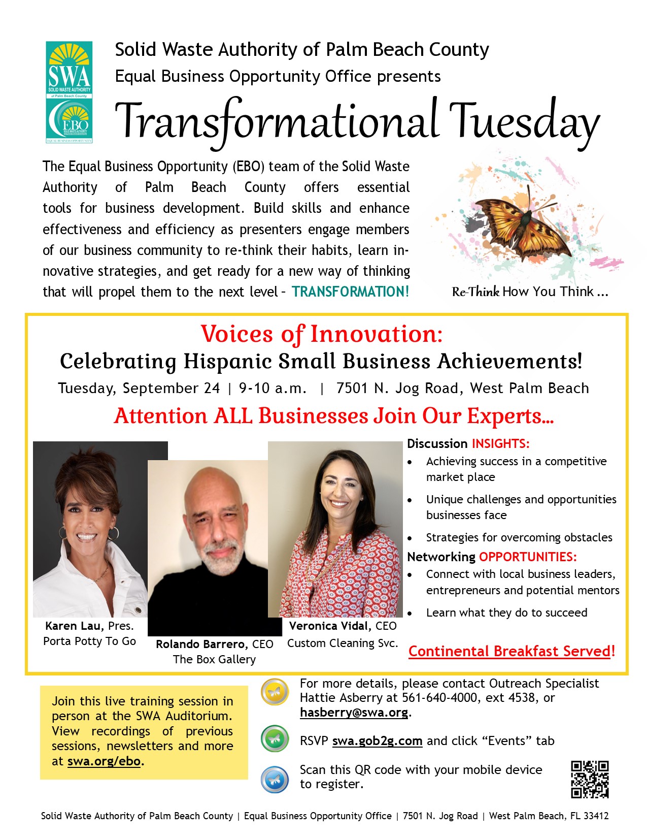 Presenters will be Karen Lau, President Porta Potty To Go; Roland Barrero, CEO The Box Gallery; and Veronica Vidal, CEO Custom Cleaning Services.